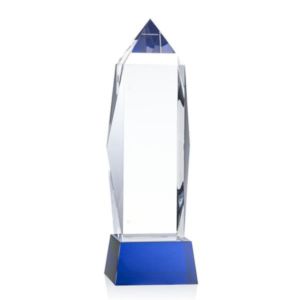 Lustrous optical crystal award with beautifully, beveled peaks and a Blue base