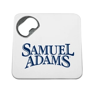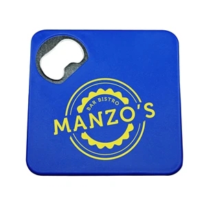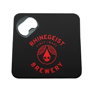 3.23" x 3.23" x .47" square coaster with foam padded bottom and corner metal bottle opener.
