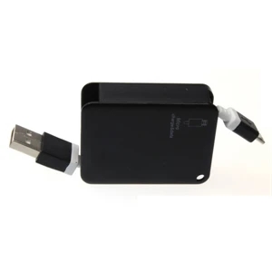 Plastic retractable charging cable with a micro-USB and lightning connector.