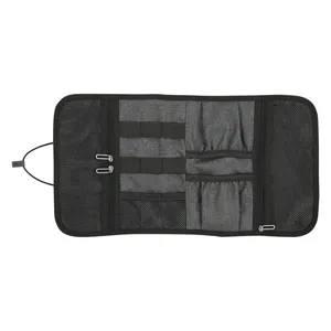 9" x 4 1/4" gray organizer made of 600 denier polyester with bungee cord closure, inside zipper mesh pockets and elastic loops.