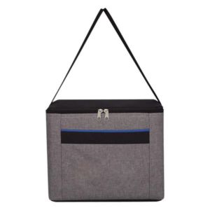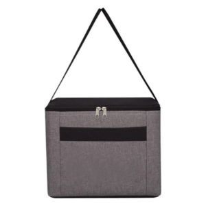 Cooler tote made of polyester with foil laminated polyethylene foam insulation, large front pocket and 22" carry handle
