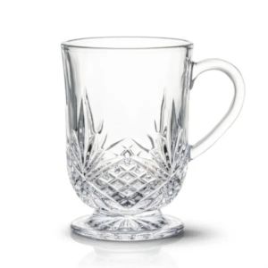The elegantly crafted lead-free crystalline Brinkley Footed Mug features intricate designs that wrap around its clear body.