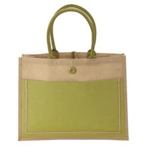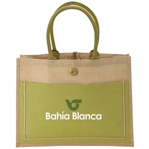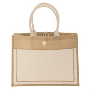 5.5" x 14" x 18.25" natural jute tote bag; includes front pocket, 5 1/2" gusset, button and loop closure, and 20" handles.
