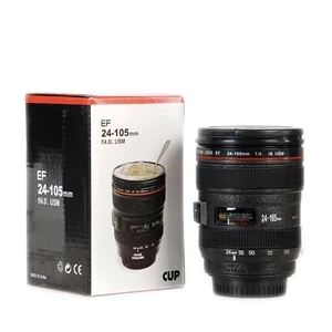 4.84" x 3.15" insulated stainless steel and ABS 13.5-ounce camera lens shaped hot or cold beverage mug with lens cap lid.