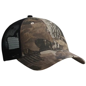 Camo mesh back six-panel cap with hook & loop closure. Blank.