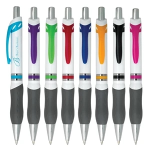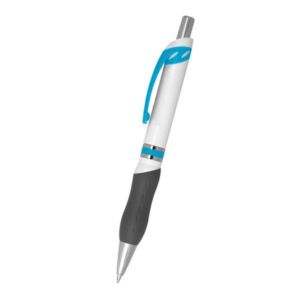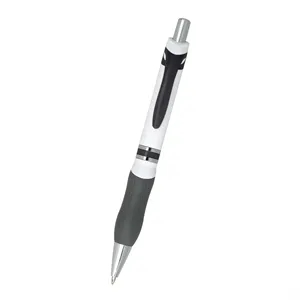 Campus plunger action pen with soft contoured gray rubber grip for writing comfort and control.