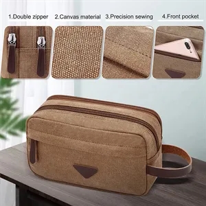 9.5" x 2.76" x 5.5" men's canvas toiletries and travel bag with two compartments, zip closure and handle.
