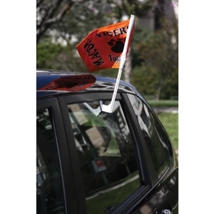 7.5" x 10.5" economy car flag on a 13" x 17" flex pole.