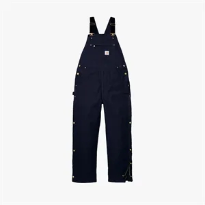 12 oz cotton duck canvas, quilted nylon lining, polyester insulation, adjustable suspenders, double-layer knees, loose fit.