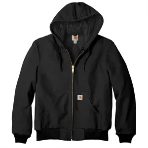 Jacket with a quilted flannel lining, three-piece hood, drawcord closure, front zipper, two interior pockets, and locker loop.