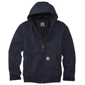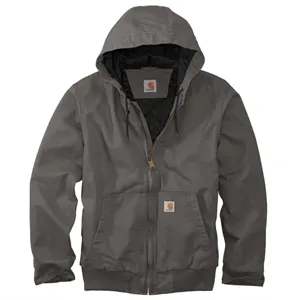 Jacket with a nylon lining, insulation, sleeves, hood, drawcord closure, front zipper, pockets, cuffs, and waistband.