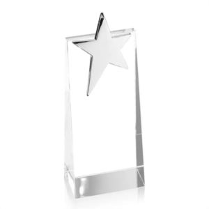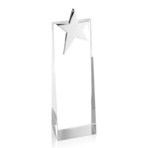 An optical crystal, tapered front and back and topped by a polished chrome star affixed to the front edge.
