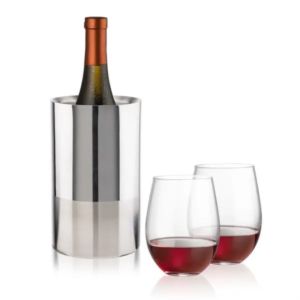 Elevate any pour with the Catania Wine Cooler & Mandelay Wine Set, featuring a sleek, polished stainless steel cooler.