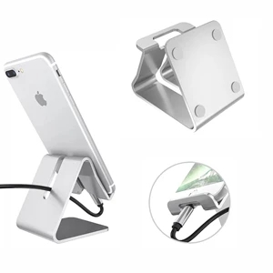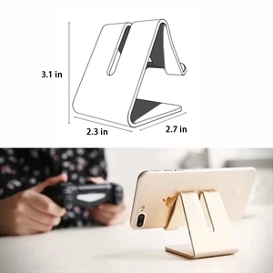 3 1/8" x 2 6/8" x 2 2/8" aluminum alloy desktop cellphone stand with non-slip pads and angled cradle.
