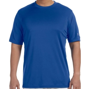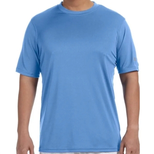 T-shirt with moisture-wicking performance, UV protection, self-fabric collar, and reflective logo.