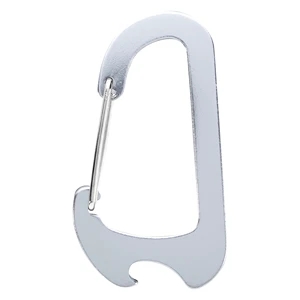 Flat carabiner that measures 1 3/4" x 3", is available in various colors and has a bottle opener feature