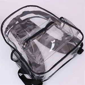 15.75" x 11.42" x 5.12" clear backpack with two side pockets, main compartment, dual zipper system, and front zipper pocket.