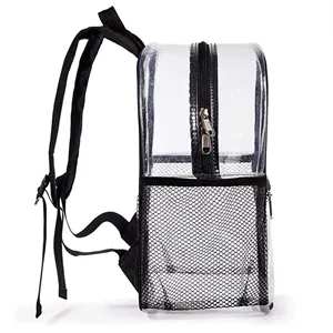 12" x 12" x 6" clear PVC backpack with zipper closure, front pocket, side bottle sleeve and adjustable shoulder straps.