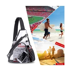 Clear sling bag with waterproof material, zipper, strap clip, shoulder strap, zip compartments, phone pocket, and bottle holder.
