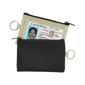 Coin pouch with zippered compartment, clear window for an ID and a key ring.