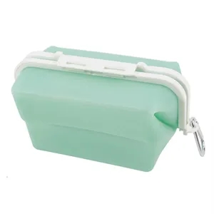 Foldable BPA-free silicone storage box with snap-lock lid and side buckles. Microwave, freezer, and dishwasher safe. Portable and