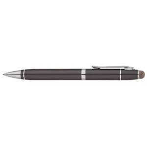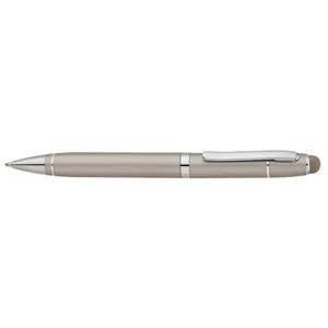 Twist action ballpoint pen with aluminum construction, chrome accents, twist tip, pocket clip and capacitive stylus.