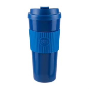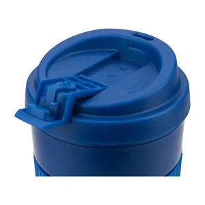 19 oz. travel coffee cup with double wall construction, flip-tab lid and TPR band.