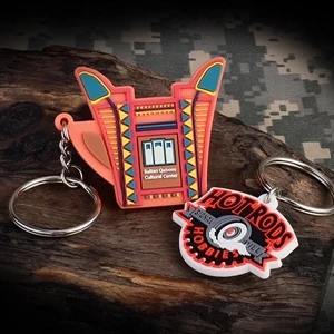 Soft PVC custom keychains in various shapes with color-filled and split rings; 3D surface, sizes range from 1"-2.5"