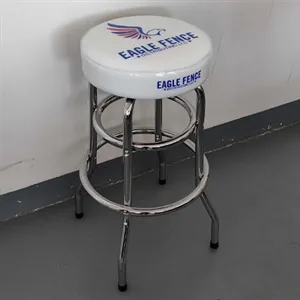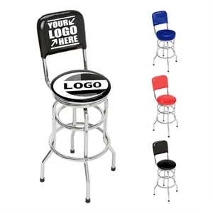 Bar stool with chrome-plated legs, a steel tubular frame, and a 360-degree revolving swivel seat.