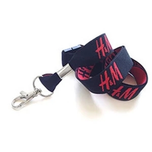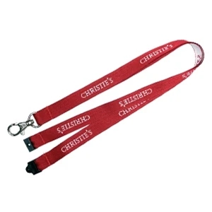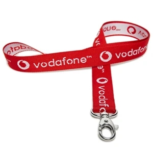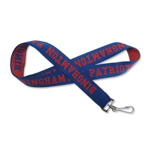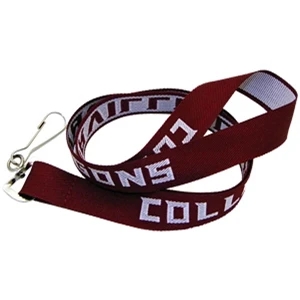 Polyester lanyards with attachment options and woven imprinting.
