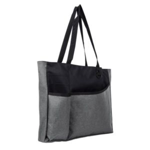 3.5" x 13" x 15" 600 Denier heathered tote bag with 3 1/2" gusset and 22" carrying handles.