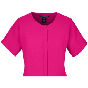 Ladies' blouse with short sleeves, hidden center front placket, buttons, back yoke, and side slits.