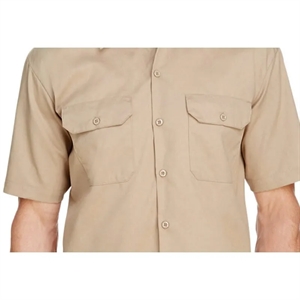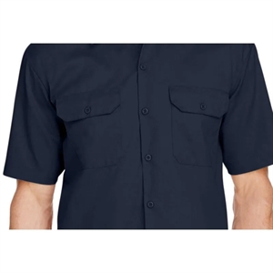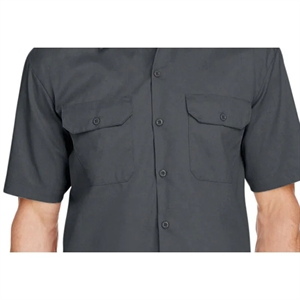 Men's work shirt with moisture-wicking performance, collar, button-front closure, chest pockets, and more.