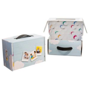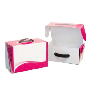 8" x 6.375" x 3.8" E-Flute box with plastic handle.