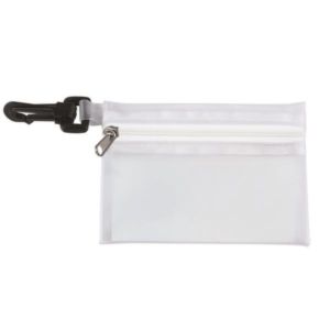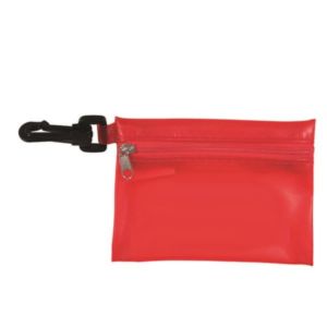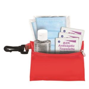 4 7/8" x 3 1/8" vinyl zip pouch with three 3-ply facemasks, 3 BZK wipes and .5 oz. bottle of hand sanitizer.