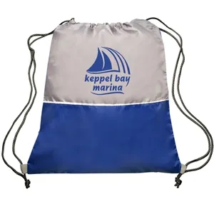 16.5" x 14.5" two-tone drawstring backpack with rope string straps.