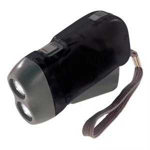 Emergency flashlight with wrist strap and hand crank and battery power options.