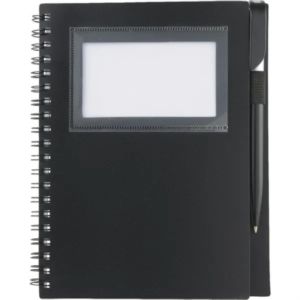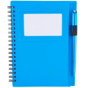 5.5" x 7" spiral notebook with twist-action ballpoint pen and 70 ruled sheets of paper.