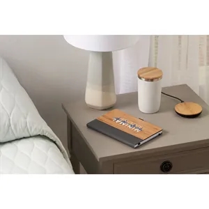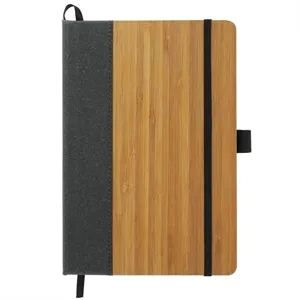 5.5" x 8.5" journal with a bamboo cover, recycled leather accent, 80 sheets or white lined paper, elastic closure, etc.