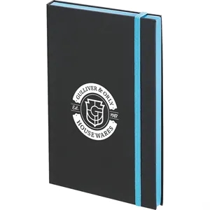 5.5" x 8.5" hard cover journal with 96 sheets of FSC® Mix cream lined paper with bright colored edges and elastic closure.