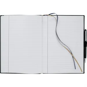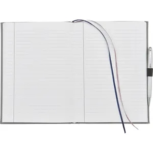 7" x 10" hardcover bound journal with 125 sheets of white lined paper, elastic pen loop and ribbon page markers.