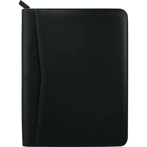 Zippered padfolio with multiple pockets, writing pad, two USB flash drive holders, two mesh ID display windows, and a pen loop.