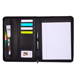 Leather padfolio with zipper closure, interior organizer, multiple pockets and a writing pad.