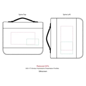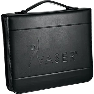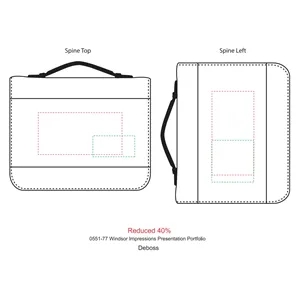 Zippered portfolio with writing pad, pen loop, two document pockets, business card holders, interior organizer, etc.