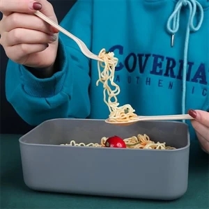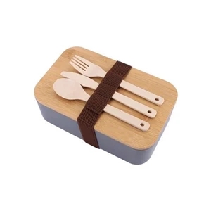 7.5" x 4.375" x 2.75" lunch box with a bamboo lid, 3-piece utensil set, and elastic strap.