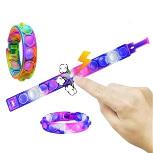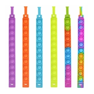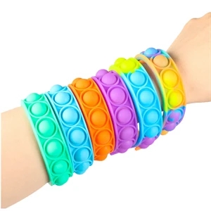 9.25" x 0.79" silicone rainbow colored bracelet with fidget toy button exterior.