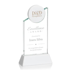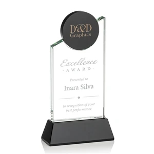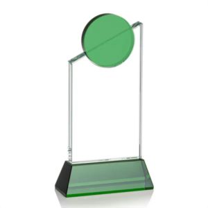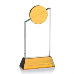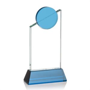 Striking Optical Crystal Fleet Award features a slanted tower with a recessed top that is adorned with a sparkling colored disk