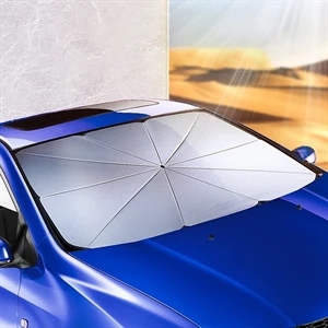 55.1" x 29.5" foldable EVA automobile windshield sunshade with umbrella style mounting.