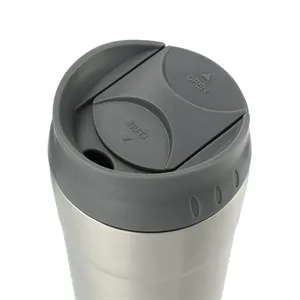 17 oz. double wall stainless steel tumbler with drink through thumb-slide push-on lid.