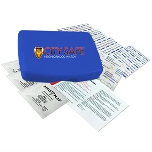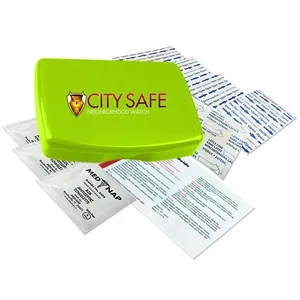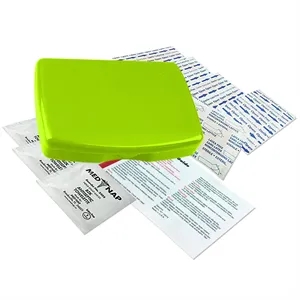 No medication first aid kit in durable, reusable, living hinge box.